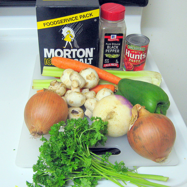Another rule, as I am learning, is that what meat contributes to good stock is an abundance of the flavor called "umami", a Japanese word meaning "deliciousness", which in its pure form is found in monosodium glutamate. If a veggie stock is going to satisfy, umami must be included from vegetable sources. Ingredients high in glutamates include ripe tomatoes and mushrooms, especially dried shiitake mushrooms. Also high in glutamates are potatoes, sweet potatoes, carrots, and peas. Thus, veggie stock will be more satisfying if it contains, at least, tomato paste, mushrooms, carrots and peas. The more of those other ingredients included in the soup, the more satisfying the broth will be. With glutamate- rich foods as a base and liberal inclusion of the standard seasoning vegetables, we can produce a stock both satisfying and tasty.